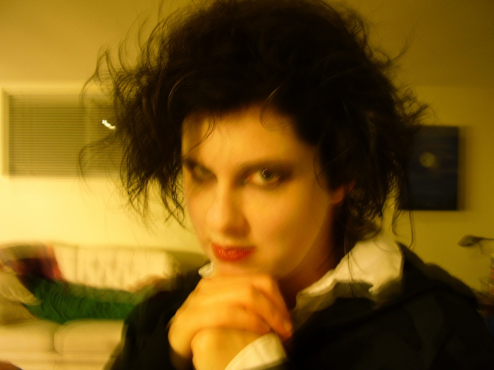 I put glue in my hair and hung my head upside down on the couch to let it dry standing up. I put white face paint on to make myself look paler, and then put tons of black eyeshadow and eye liner on, with red lipstick. Drew spray-painted my hair black to add colour and some extra stand-up power.